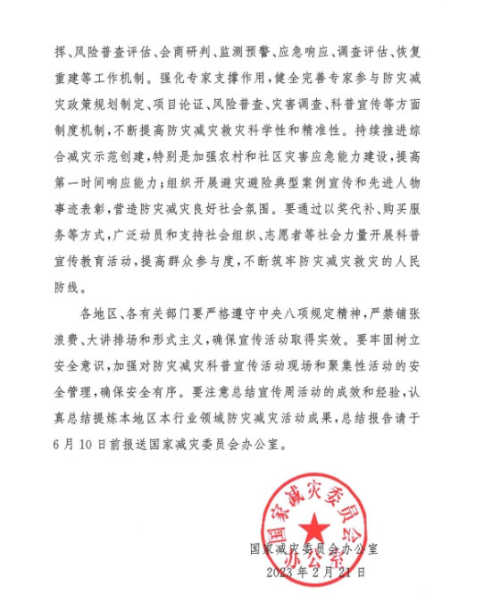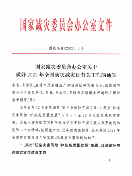 現將《國家減災委員會辦公室關于做好2023年全國防災減災日有關工作的通知》(國減辦發〔2023〕5號)轉發給你們,并提出如下要求,請一并抓好落實。